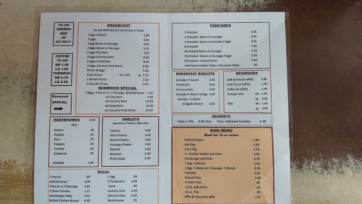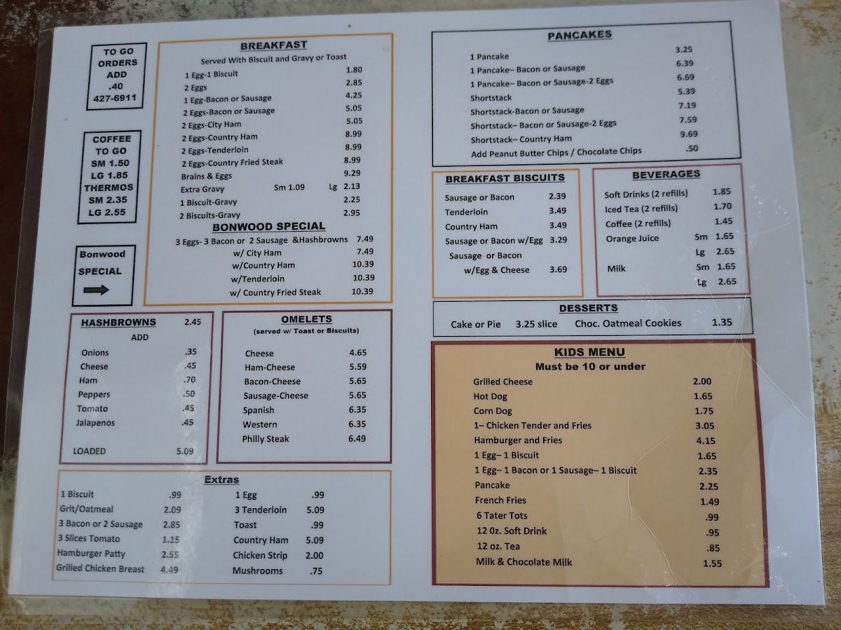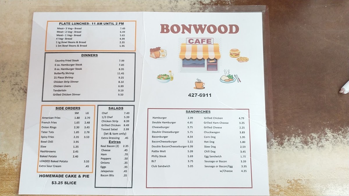 Bonwood Cafe offers a straightforward, comforting menu that feels right at home in its welcoming family restaurant setting. The menu features classic American breakfast and lunch favorites that suit relaxed mornings and casual midday meals alike.